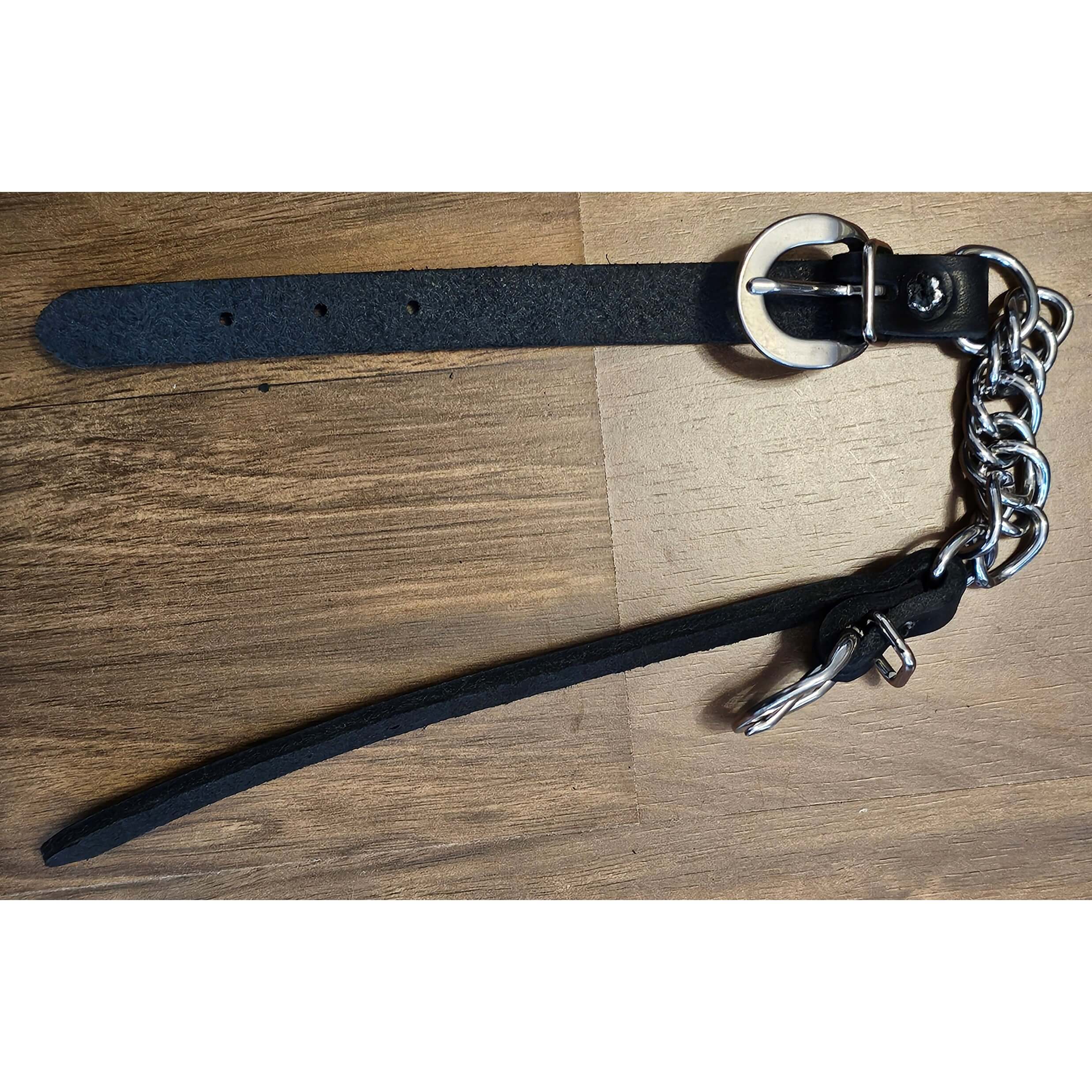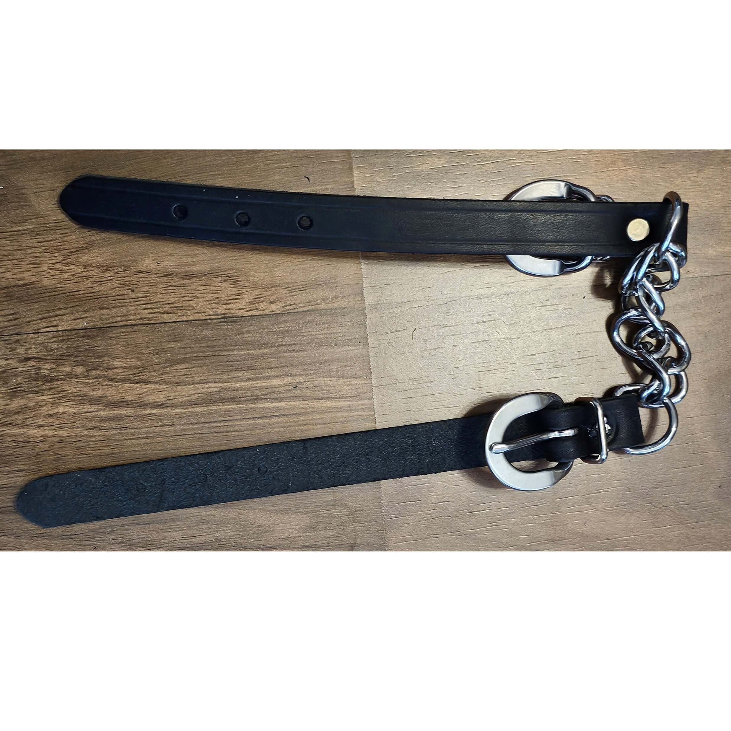 Black Latigo leather curb twisted chain straps. Made in the U.S.A. Quality Black Latigo leather with 5/8″ twisted chain. Curbs have buckles and adjustments on both sides with stainless steel hardware. by Saddles N Such